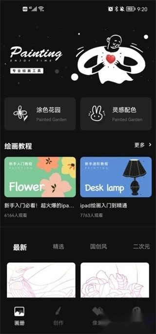 1、首先大家进入iartbook绘画应用,我先介绍一下各板块的使用方法和内容。在画册板块里,大家可以进行新手学习,还能找到最新的各类填色内容。