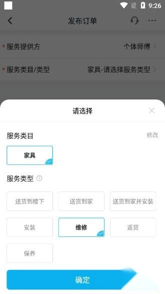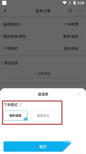 4.选择下单模式,你可以选择通过报价来寻找服务,也可以自行指定师傅上门提供服务;
