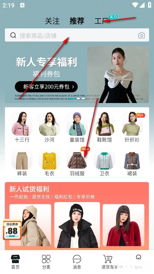 点击软件进入首页后,我们可以在顶部选择相关推荐,也能直接寻找源头工厂拿货;既可以搜索自己心仪的品牌衣物,也能在推荐中查找所需的衣服品类。