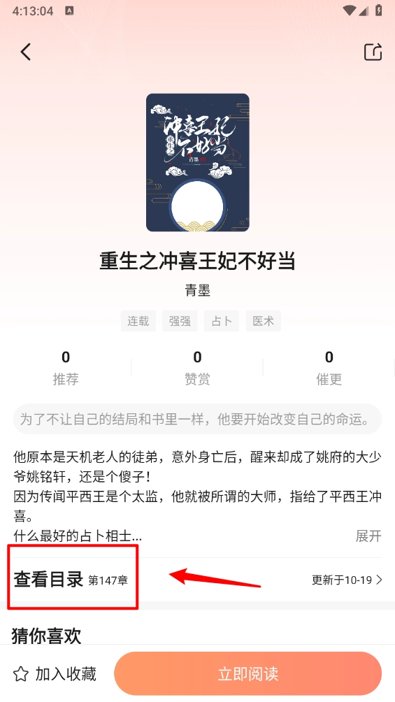 1、启动软件后,找到想要查看的小说并进入其详情页面,接着点击“查看目录”按钮。
