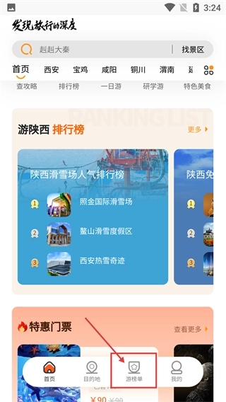 1、在应用首页,点击底部导航栏的【游榜单】按钮,进入旅游榜单汇总页面,就能看到景点、美食等不同分类下的各类榜单。