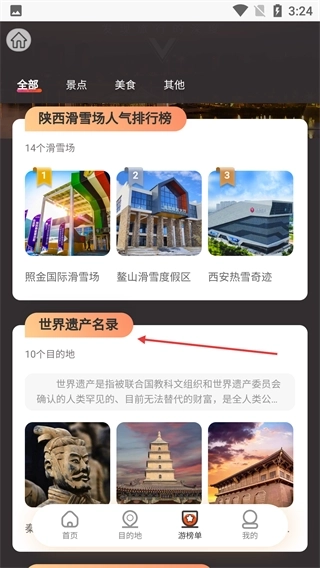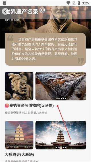 2、进入游榜单页面后,找到【世界遗产名录】板块并点击,进入陕西世界遗产景点详情页,展示了遗产类景点。
