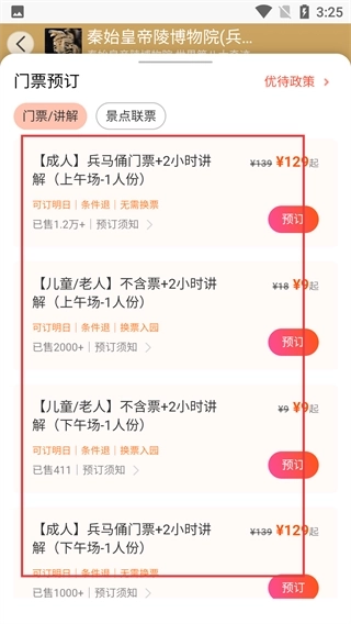 4、进入景点页面后,找到对应的门票预订选项(涵盖不同人群、场次的套餐),点击相应套餐旁边的【预订】按钮,就能继续进行门票预订流程。