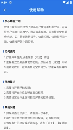 双击桌面是惠州市奕创科技有限公司开发的手机操作自定义工具,旨在提升手机操作效率,为用户带来全新使用体验。该手机版采用极简界面设计,简洁直观,用户能快速掌握操作流程。支持自由添加多种快捷动作,如双击屏幕、轻触手机背部等,可帮助用户一键打开常用软件、联系人、网站等功能。感兴趣的用户不妨前来体验!