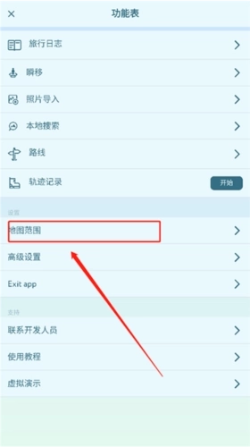 1、在“功能表”页面选择“地图范围”选项。