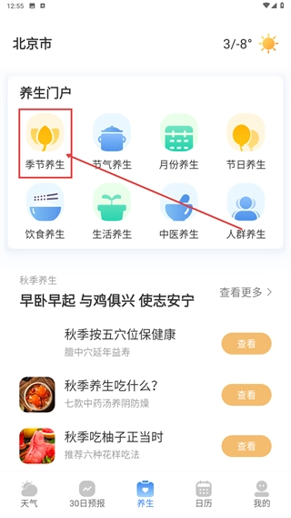 2、在养生页面的“养生门户”板块中,点击选择【季节养生】这一分类,即可进入季节养生的详细内容页面。