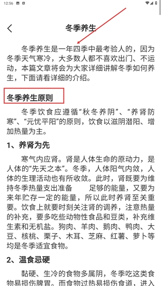 4、进入冬季养生详情页面后,能查看“冬季养生原则”之类的内容,从而知晓养肾、饮食等季节性养生的关键要点。