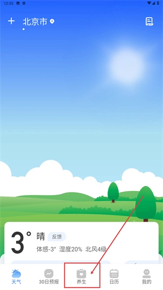1、打开天气应用后,在首页点击底部导航栏里的【养生】选项,即可进入养生内容页面。