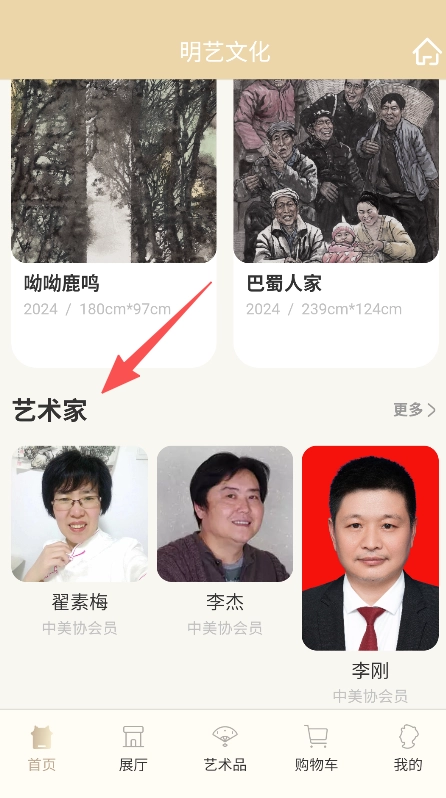 1、打开软件进入首页,找到艺术家板块,查看展示的艺术家信息。