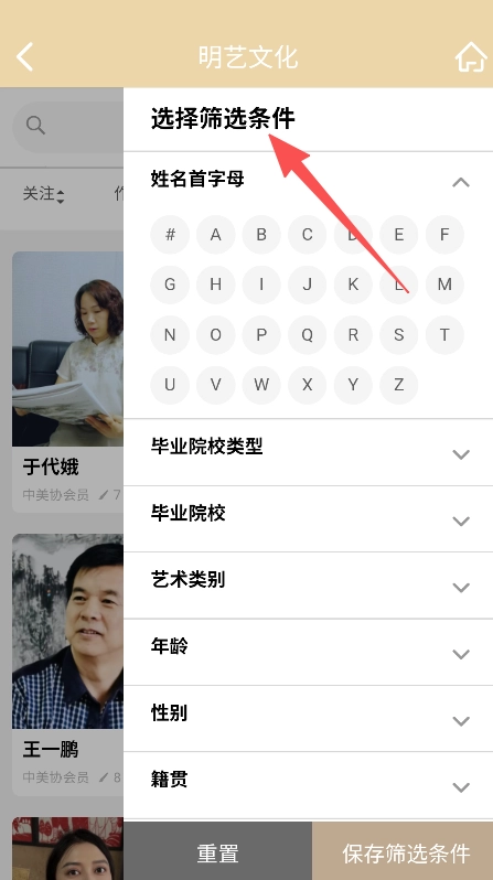 2、配备艺术家筛选功能,可根据姓名首字母、毕业院校类型等条件进行筛选。