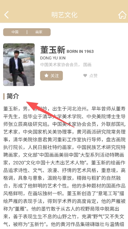 3、选择筛选后的艺术家,进入其页面,查看详细简介内容。