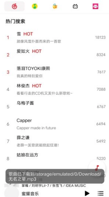 1.并蜜罐音乐(蜜獾音乐),打开后,选择或搜索想要的歌曲,直接即可。