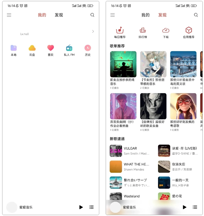 使用蜜罐音乐时,启动软件会呈现两个页面:其一为私人歌单页,涵盖本地、喜欢、历史等功能;其二是歌单广场,会推荐丰富多样的歌单资源。
