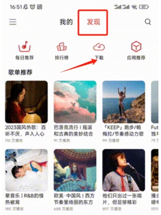 2.后可以点击顶部发现,选择,查看已的歌曲