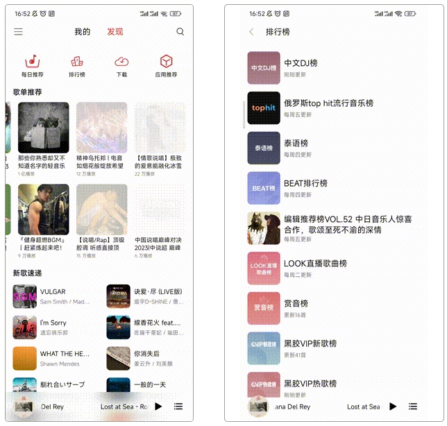 3.歌单广场拥有丰富的歌曲资源,每日推荐功能需要登录后才能使用。此外,还有多种类型的排行榜可供选择,例如飙升榜、新歌榜、原创榜、热歌榜、说唱榜、黑胶榜等。