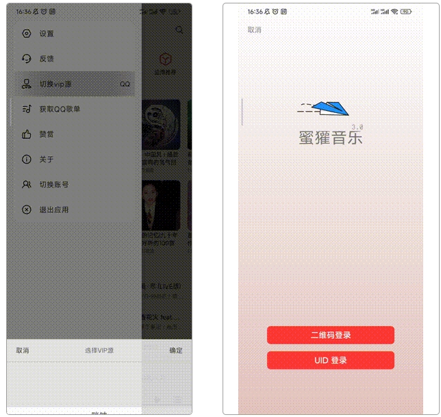 用户可通过打开左侧菜单栏,访问歌单、在四个不同的VIP资源间切换以及登录账户。登录方式提供便捷的扫码登录和传统的UID登录两种选择。