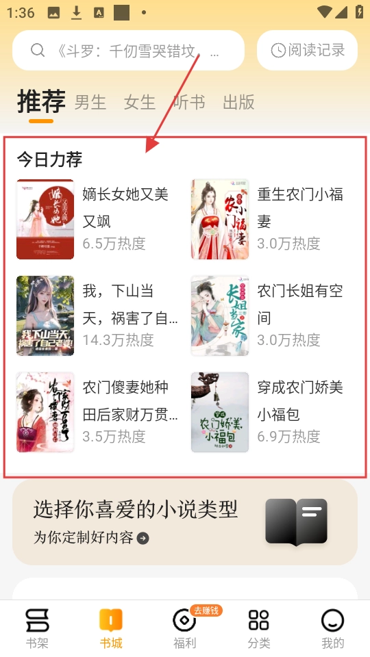 1、在书城推荐页面,点击今日力荐的书籍(例如《嫡长女她又美又飒》),就能进入书籍详情页了。