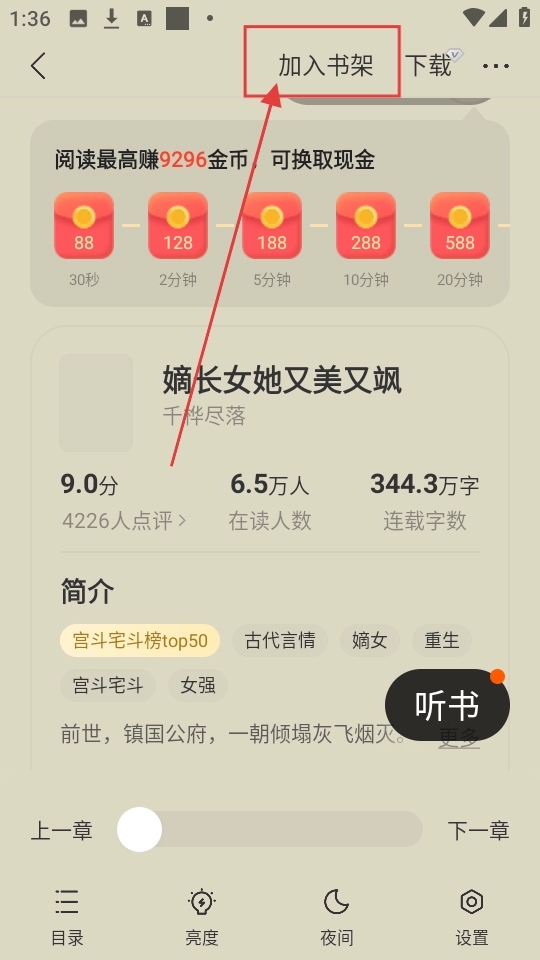 2、进入书籍详情页后,点击【加入书架】,可将书籍加入书架方便后续阅读哦。