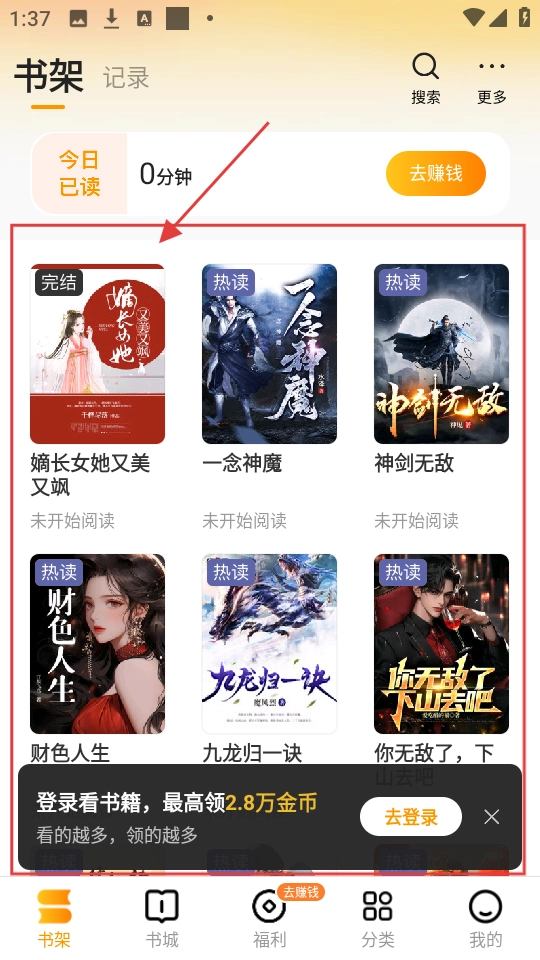 4、进入书架页面,就能看到已经添加到书架里的书籍,像《嫡长女她又美又飒》这类,随时阅读起来很方便呢。