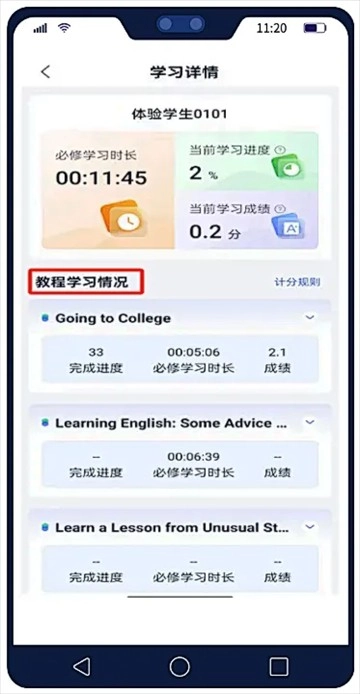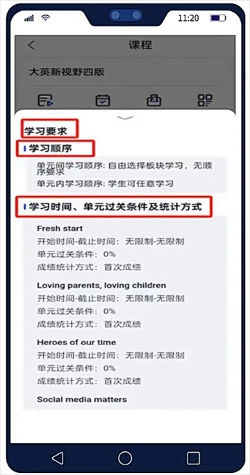 03激活后,点击想要学习的教程封面,在【学习要求】板块能够查看学校针对该教程的具体学习规定,像学习顺序、学习时长、单元考核条件、成绩统计方法以及计分规则等内容都包含在内。