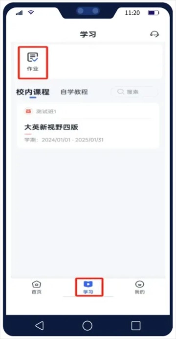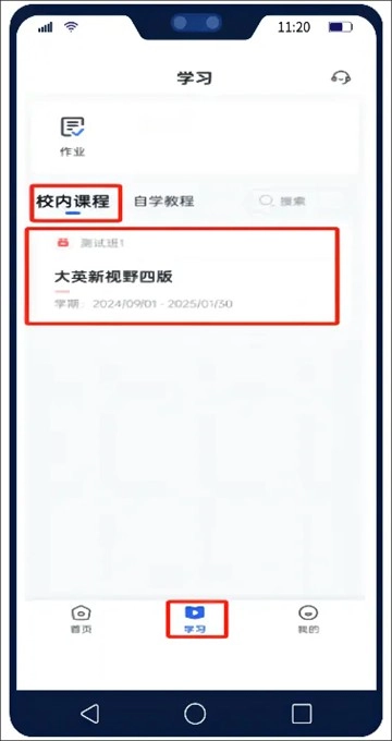 01进入,点击页面下方【学习】,【校内课程】中是当前班级中的课程。点击对应课程,查看该课程中的全部教程。