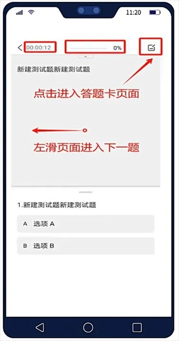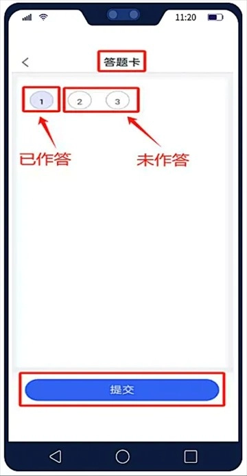 02作答页面顶部会显示作答时间与进度。完成当前题目作答后,向左滑动页面即可进入下一题。所有题目都完成作答后,点击右上角的答题卡按钮,就能进入答题卡页面,查看自己的作答情况并提交答案。