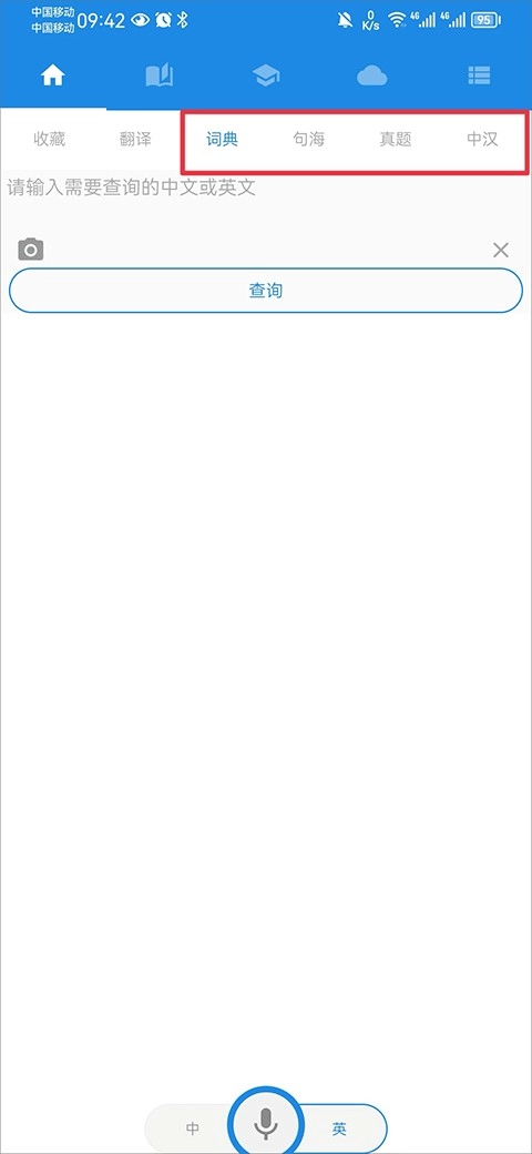 4、除了能够翻译中文与英文外,你还可以借助软件来查询中文和英文的词语、句子、真题以及中汉等内容。