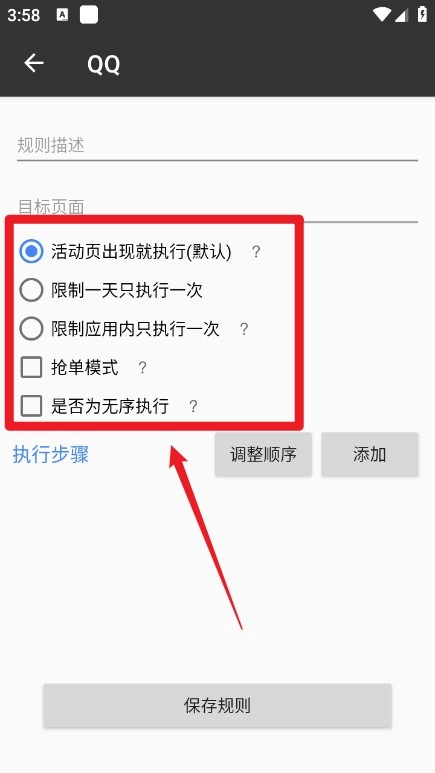 4、输入规则描述与目标页面,勾选需要执行的规则及步骤,最后保存规则即可。