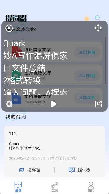 - 悬浮窗提词:可开启悬浮窗功能,在任意界面都能展示提词内容。
